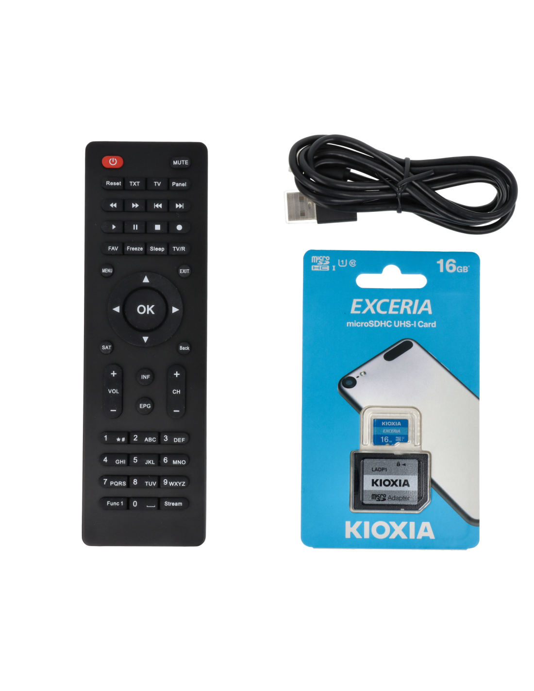 Caméra intégrée, carte microSD 16 Go, câble USB, manuel d’utilisation en français.