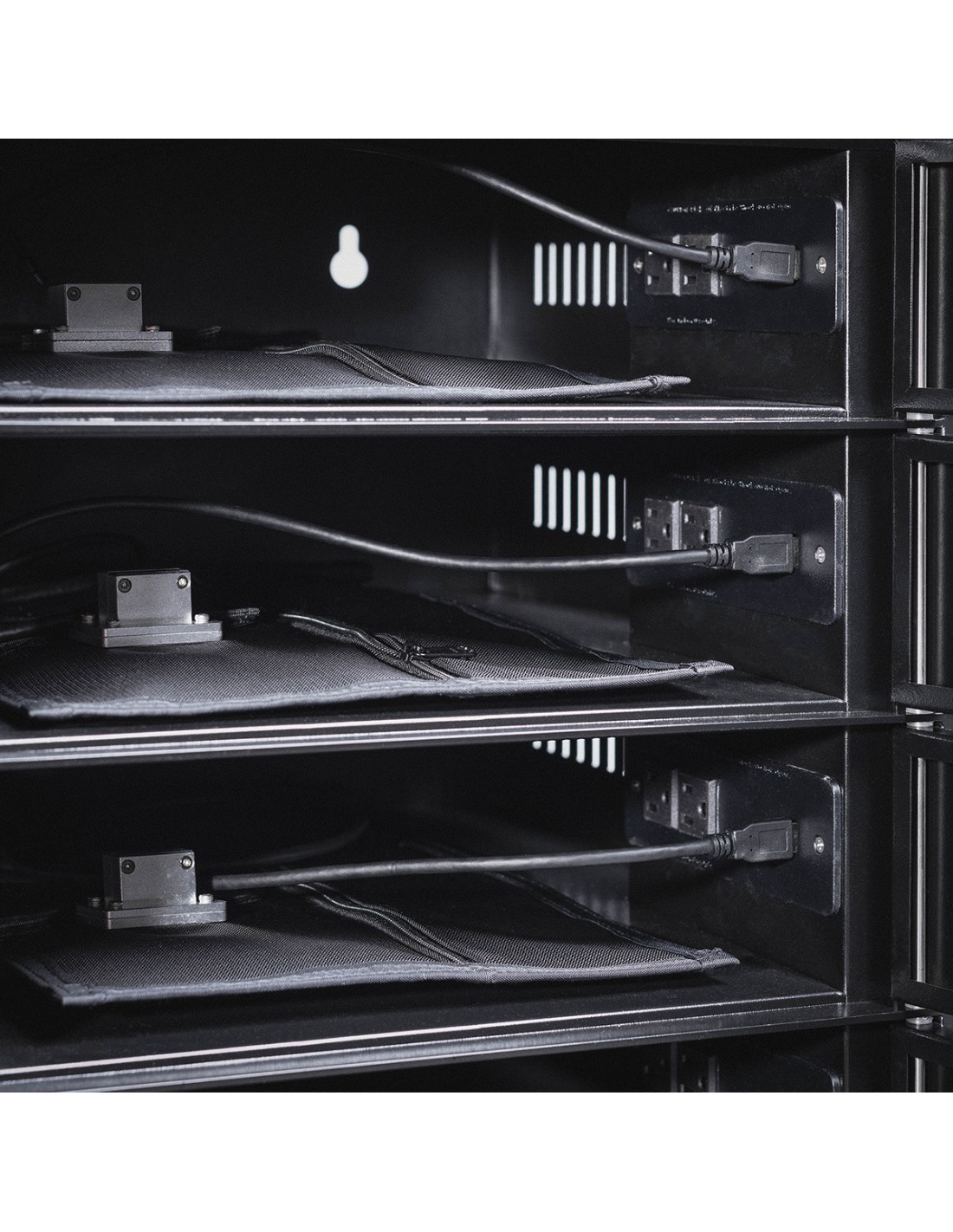 Des grilles de ventilation latérales assurent la circulation d'air à l'intérieur de l'armoire, évitant toute surchauffe des appareils lors de sessions de charge prolongées.