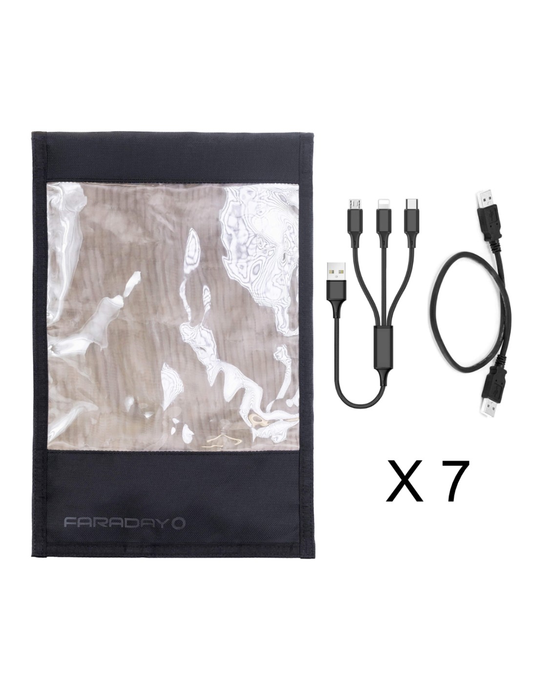 - 7 pochettes Faraday avec hublot et port de charge — une par compartiment