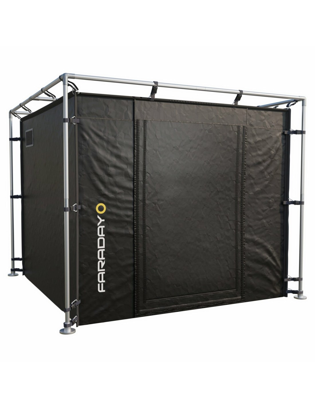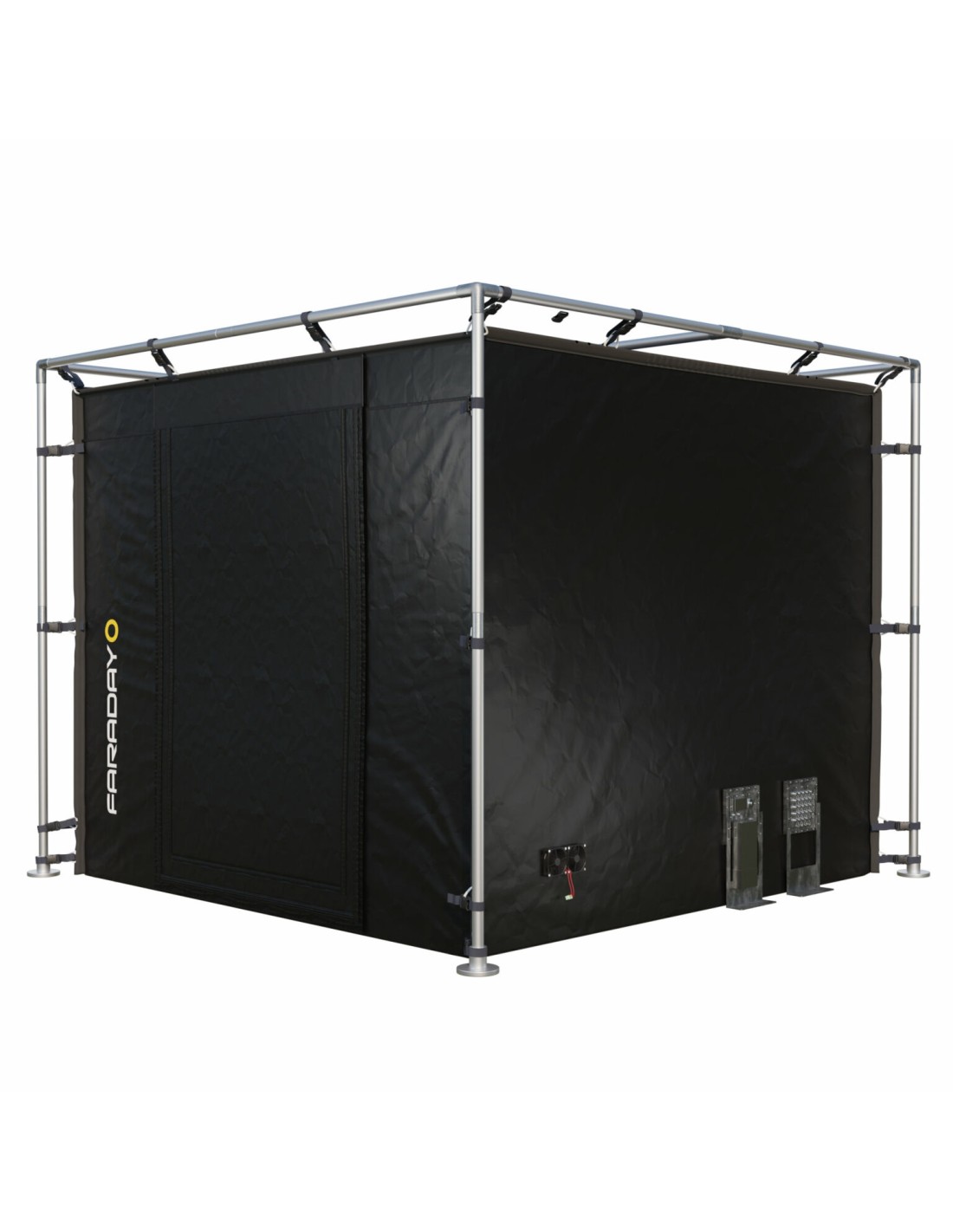 La tente est construite en double paroi avec fil Faraday et coutures renforcées haute résistance, garantissant l'étanchéité électromagnétique en usage intensif et répété, y compris lors de déploiements fréquents sur le terrain.